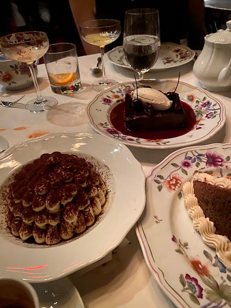 Dessert was a pine-cone-shaped tiramisu, a black forest cake, and a carrot cake edged with a wavy pipe of cream cheese frosting. Andrew and I clinked our espresso cups — cin cin — and drank them down. On the way out, Liane grabbed several Italian candies from the bowl by the door. Lemon, strawberry, and chocolate. Claire said she was keeping the paper bag with the Carbone logo.