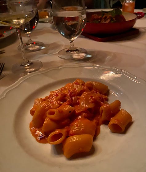 The infamous spicy rigatoni came. “Ring around the rosy,” our captain said, setting it down, and we all looked at each other and asked what that meant, but he had already drifted off. Hospitality, Danny Meyer writes, is present when something happens for you, and absent when something happens to you. Every small thing at Carbone happened for us. The warm Ginori plates, set so the logo would face me when I flipped them over. The asparagus shaved smooth, no fibrous surprise. The espresso martini and the Vesper arriving in the exact middle of a story, like they’d been waiting for a pause.